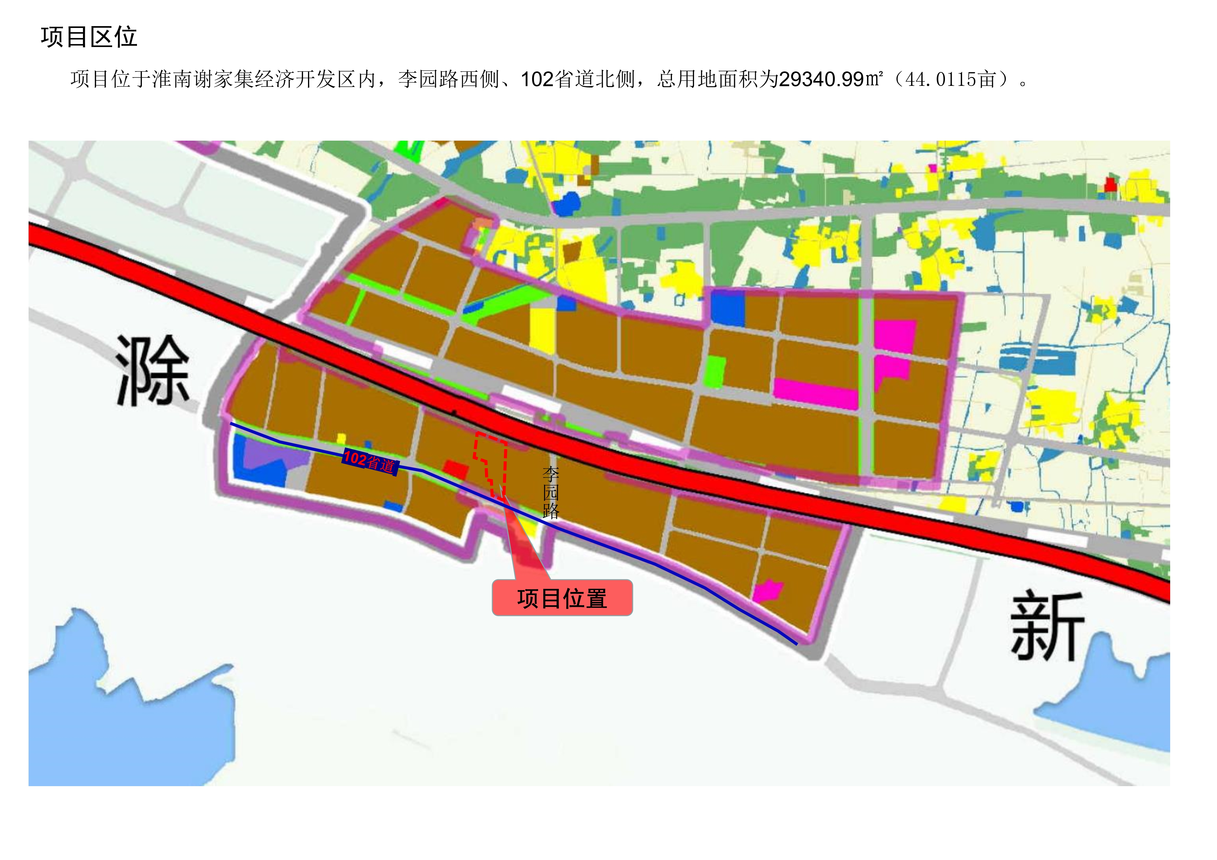 项目地块位于淮南谢家集经济开发区内,李园路西侧,102省道北侧,总用地面积为29340.99㎡。